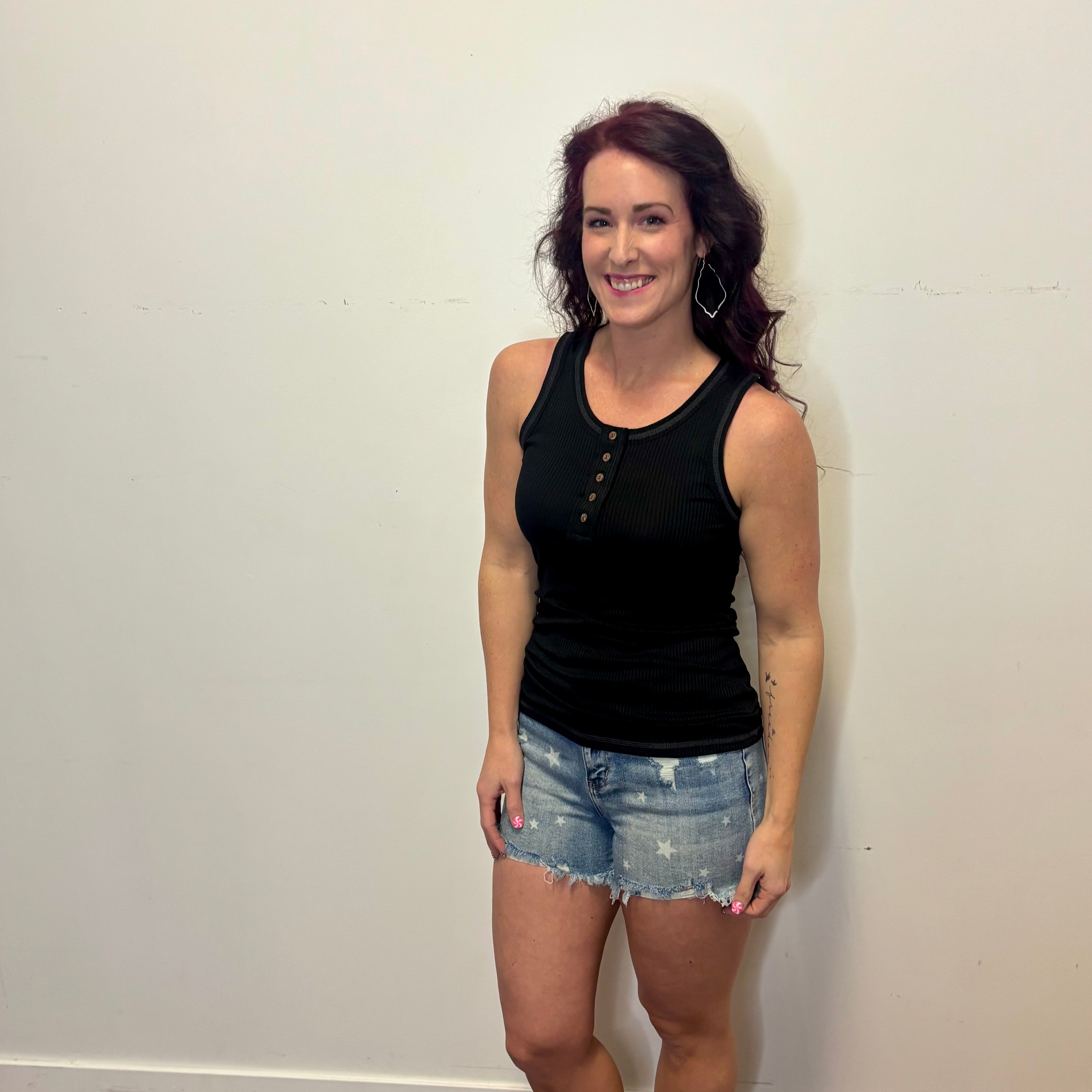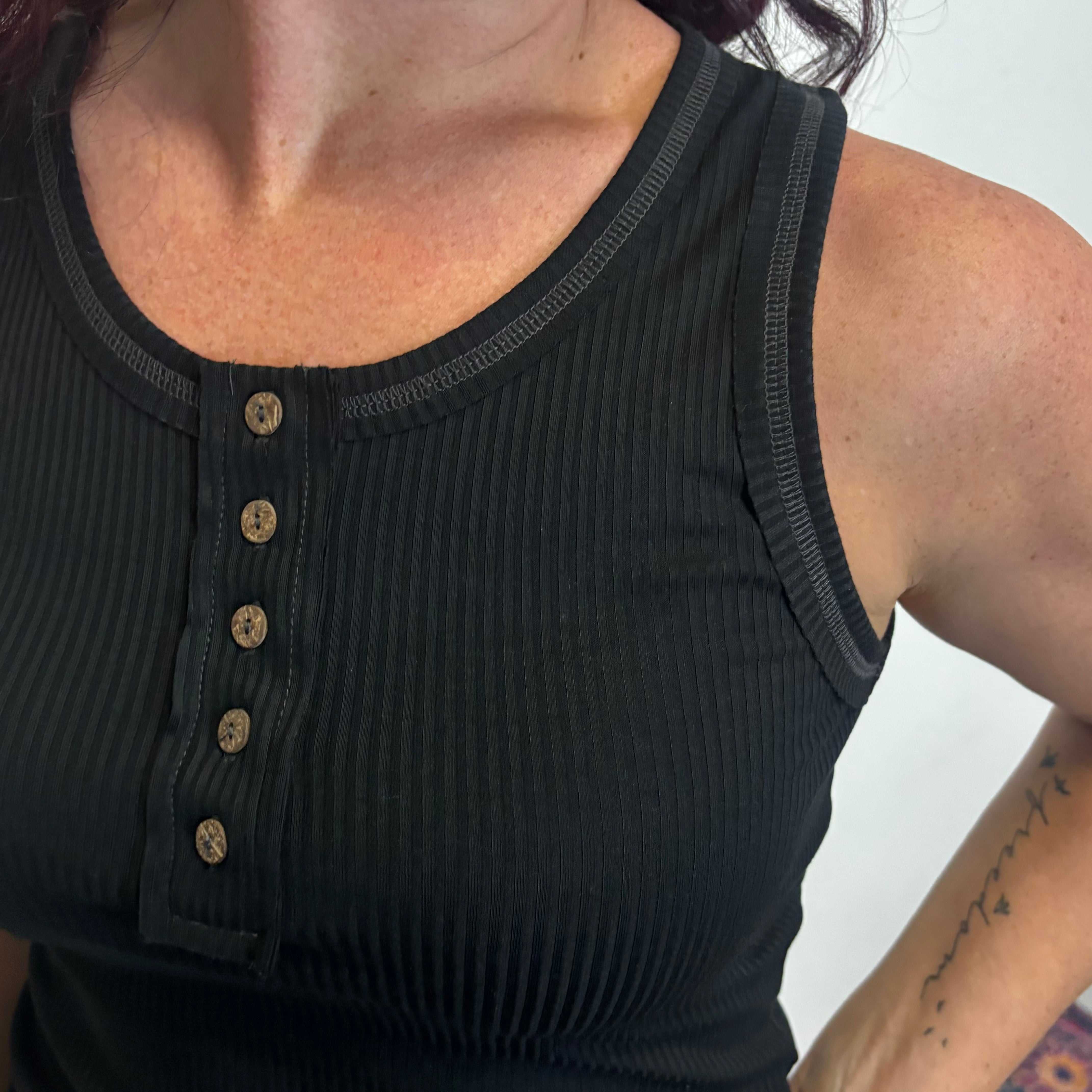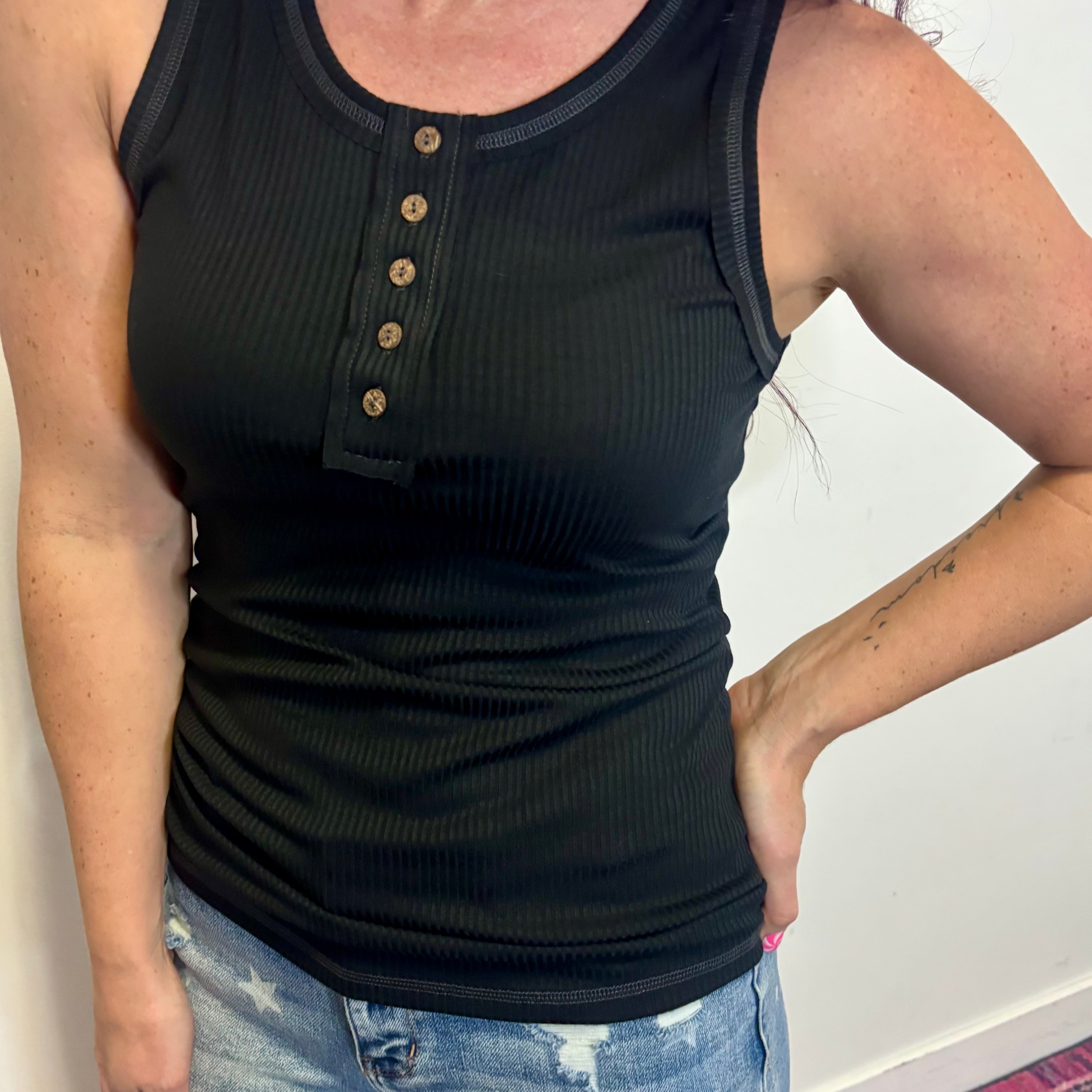 Meet your new go-to tank top. This ribbed henley features a flattering scoop neckline and a fitted silhouette that works with your body, not against it. The stretchy fabric moves with you throughout your day, while the timeless black color makes it a wardrobe essential that pairs seamlessly with everything from jeans to skirts. Simple, comfortable, and endlessly versatile.