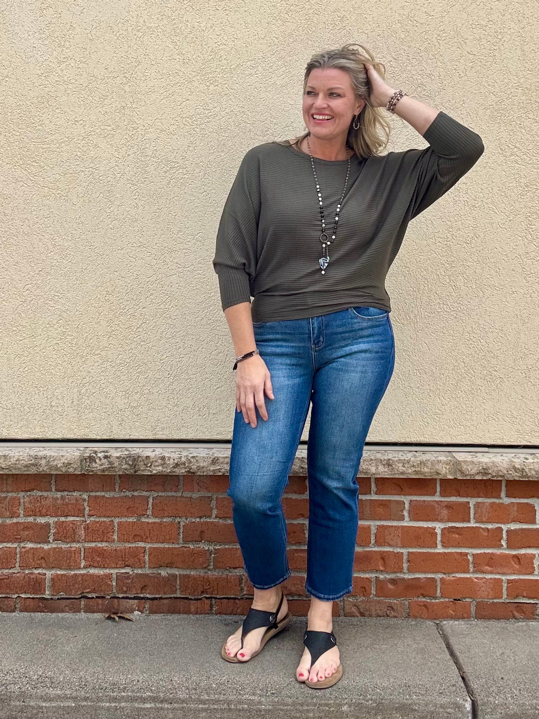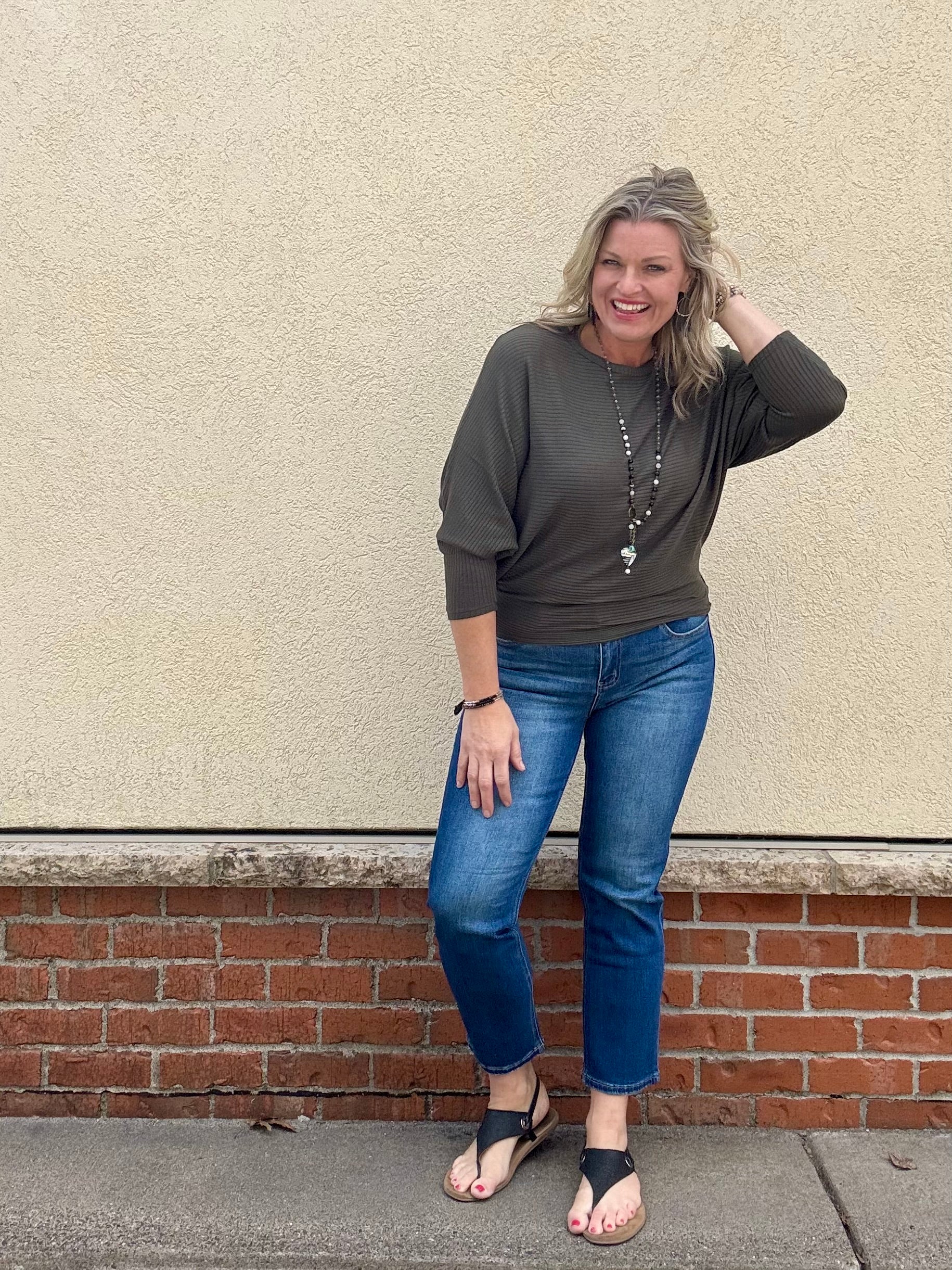 Olive Ribbed 3/4 Sleeve Dolman Top