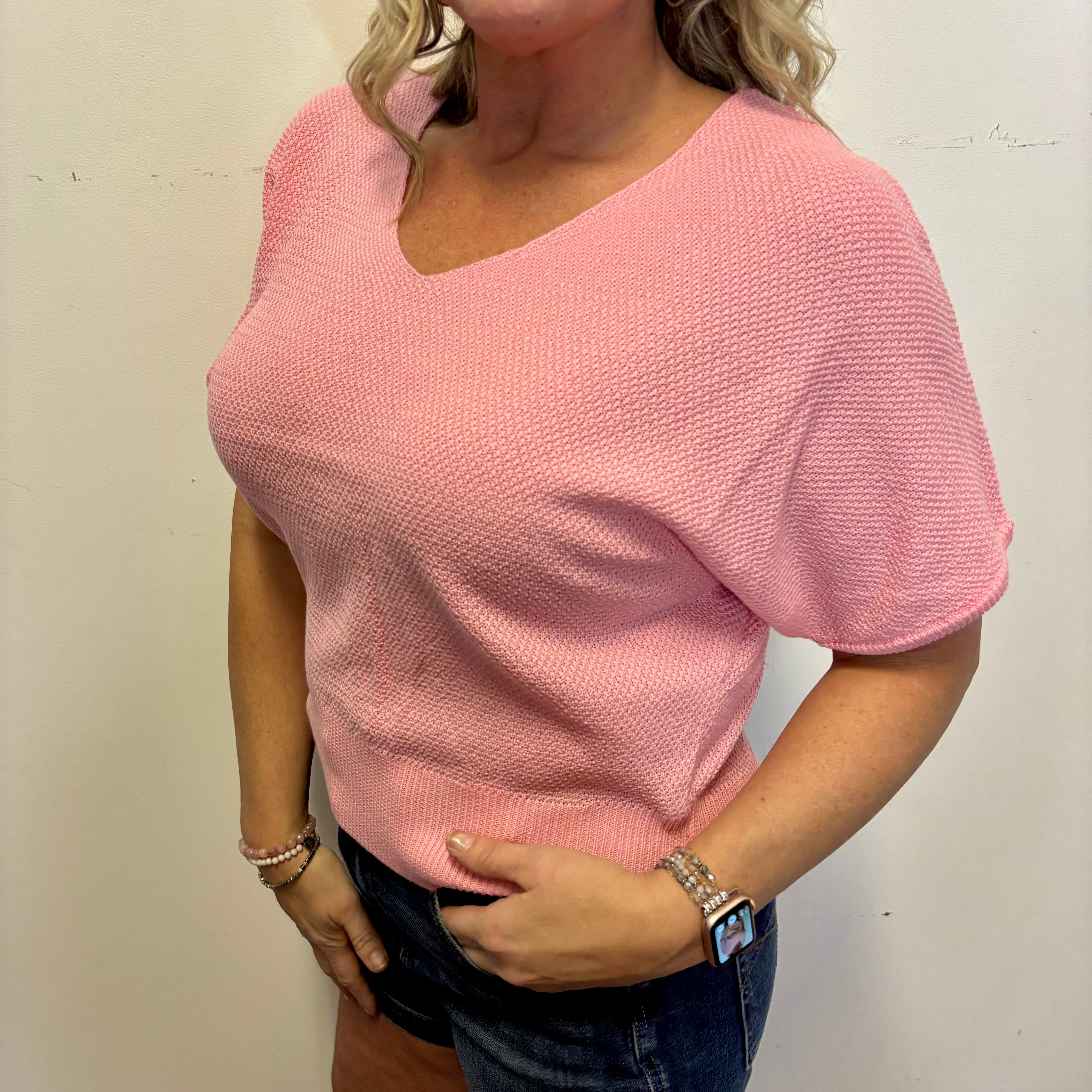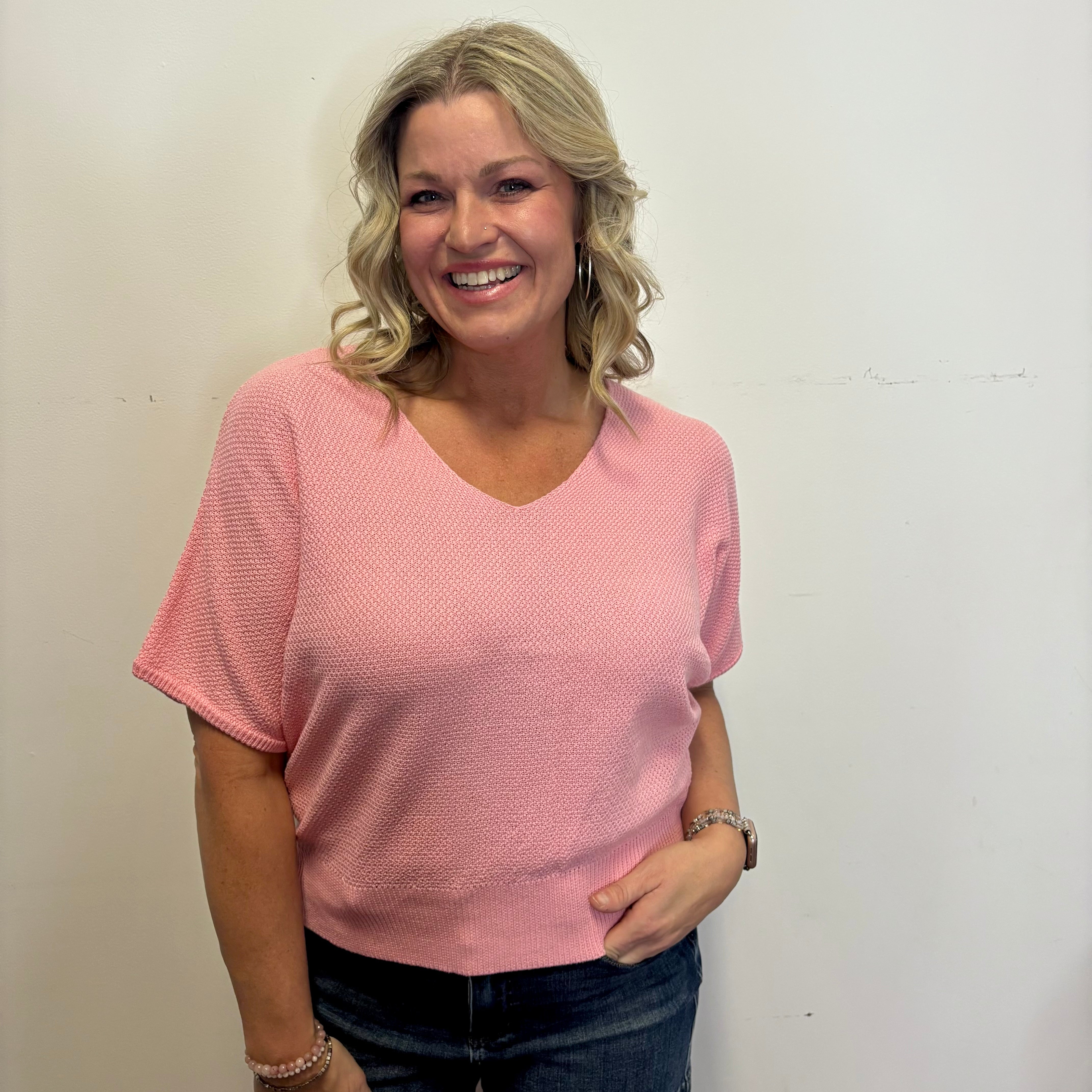 Slip into comfort with this short sleeve dolman that's designed to flatter. The relaxed fit and flowing sleeves create an easy, breezy vibe perfect for any occasion. A classic V-neck pairs with a ribbed hem for structure and polish. In a gorgeous Pink shade, this top layers beautifully and works just as well on its own. Simple, stylish, and made for real bodies.