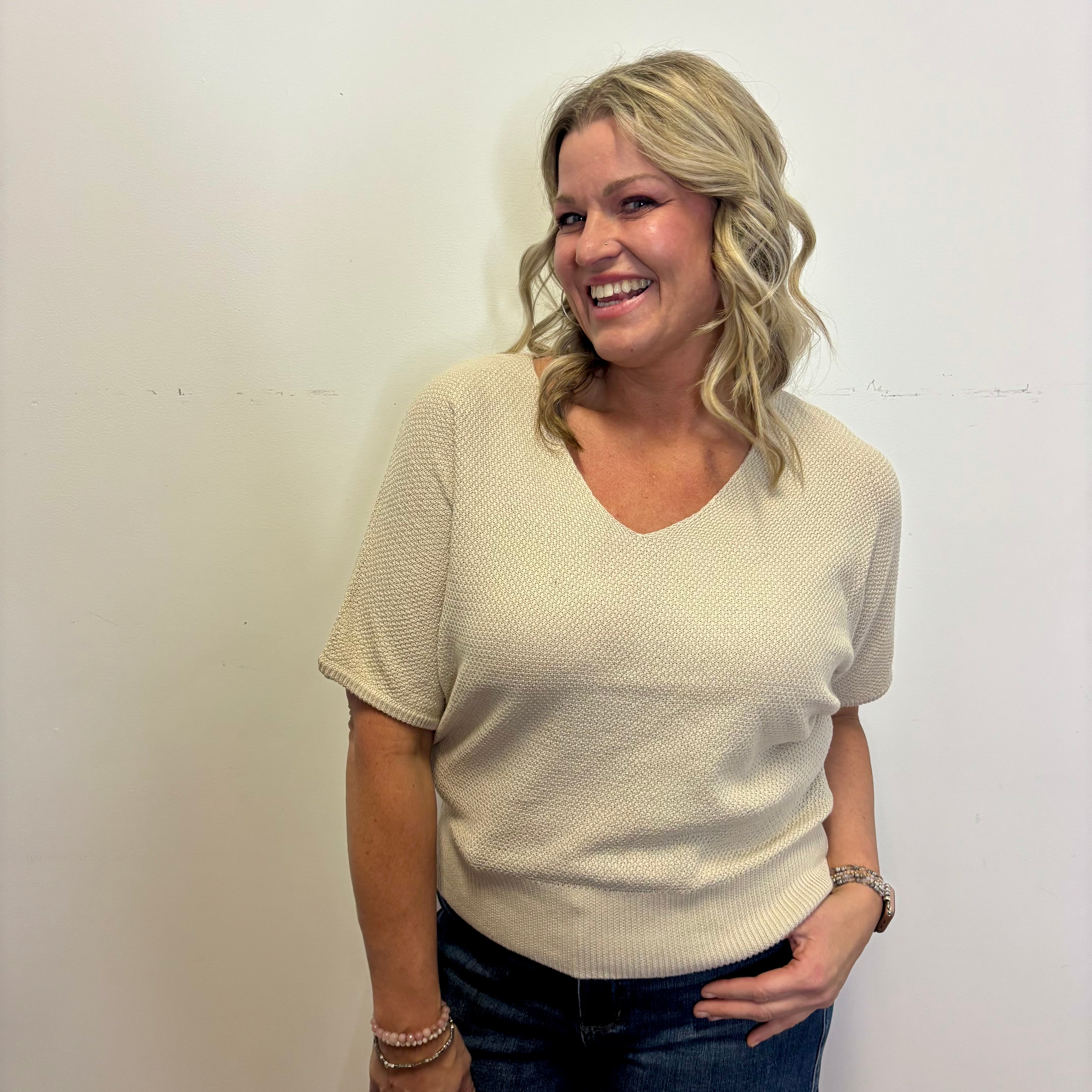 Slip into comfort with this short sleeve dolman that's designed to flatter. The relaxed fit and flowing sleeves create an easy, breezy vibe perfect for any occasion. A classic V-neck pairs with a ribbed hem for structure and polish. In a gorgeous Sand Beige shade, this top layers beautifully and works just as well on its own. Simple, stylish, and made for real bodies.