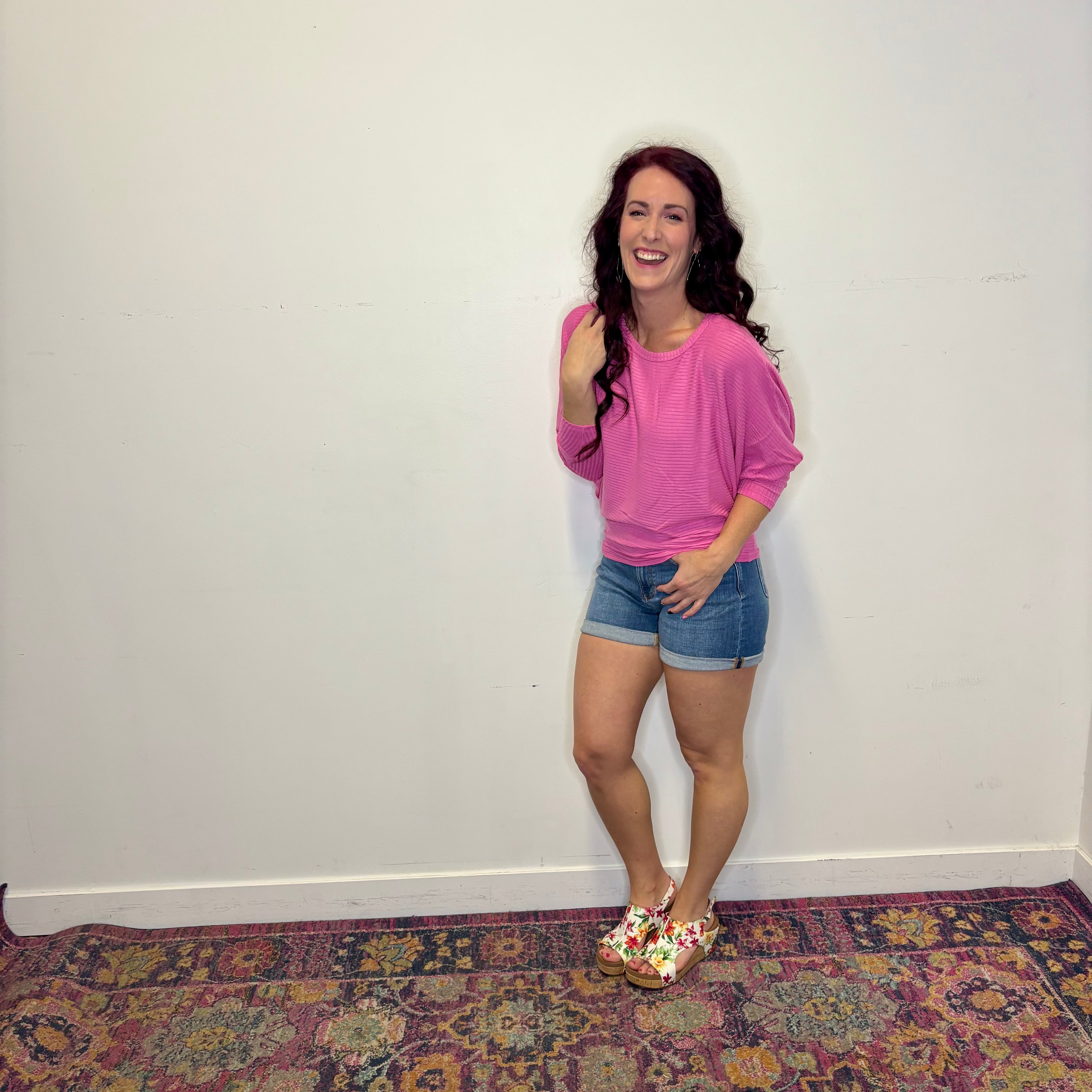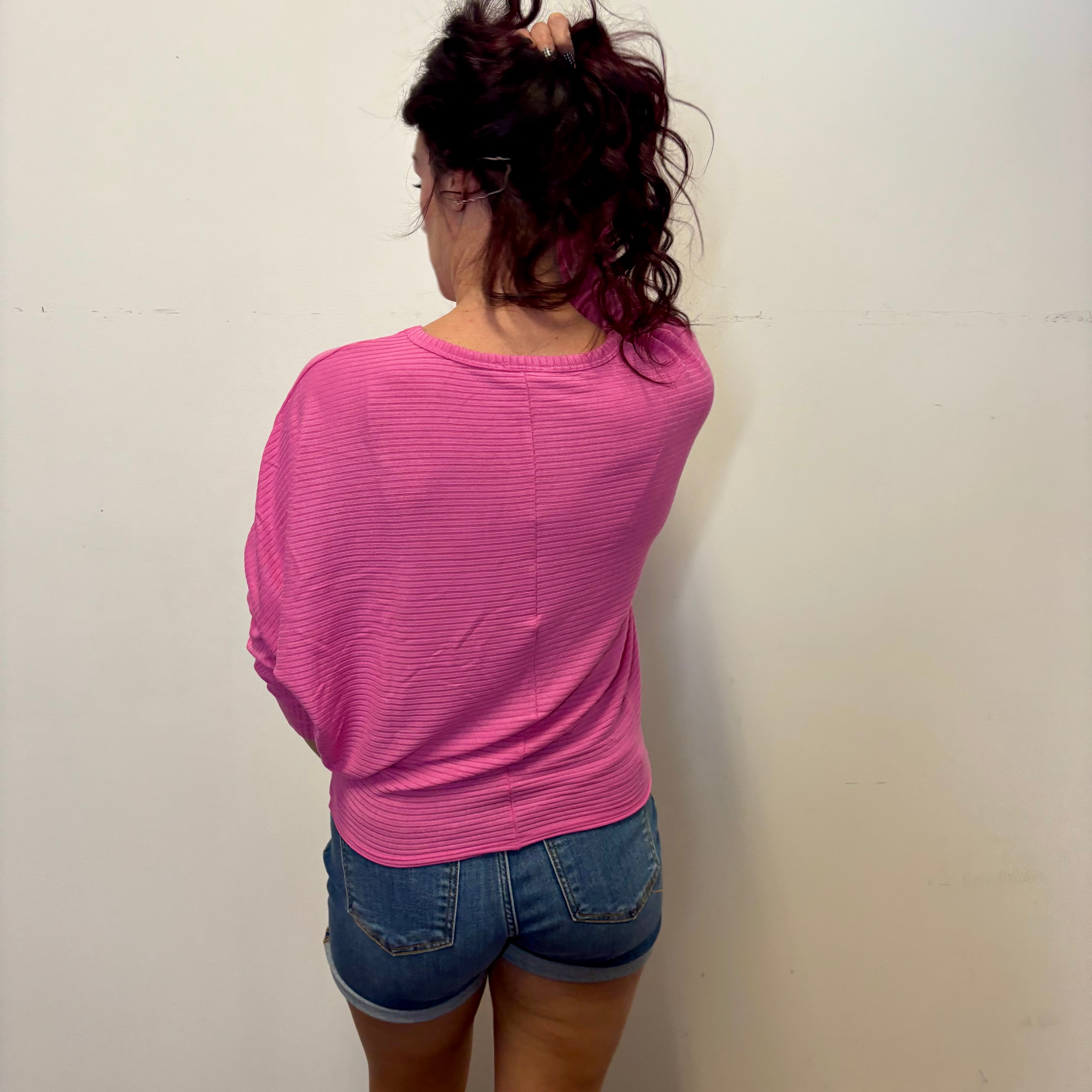 Discover comfort meets style in this pink ribbed dolman top. The generous dolman sleeves drape beautifully while the stretchy ribbed fabric molds to your frame for a flattering, relaxed fit. Whether you're dressing it up with tailored pants or keeping it casual with your favorite jeans, this versatile piece adds a pop of color to your everyday rotation. Soft, breathable, and endlessly wearable.