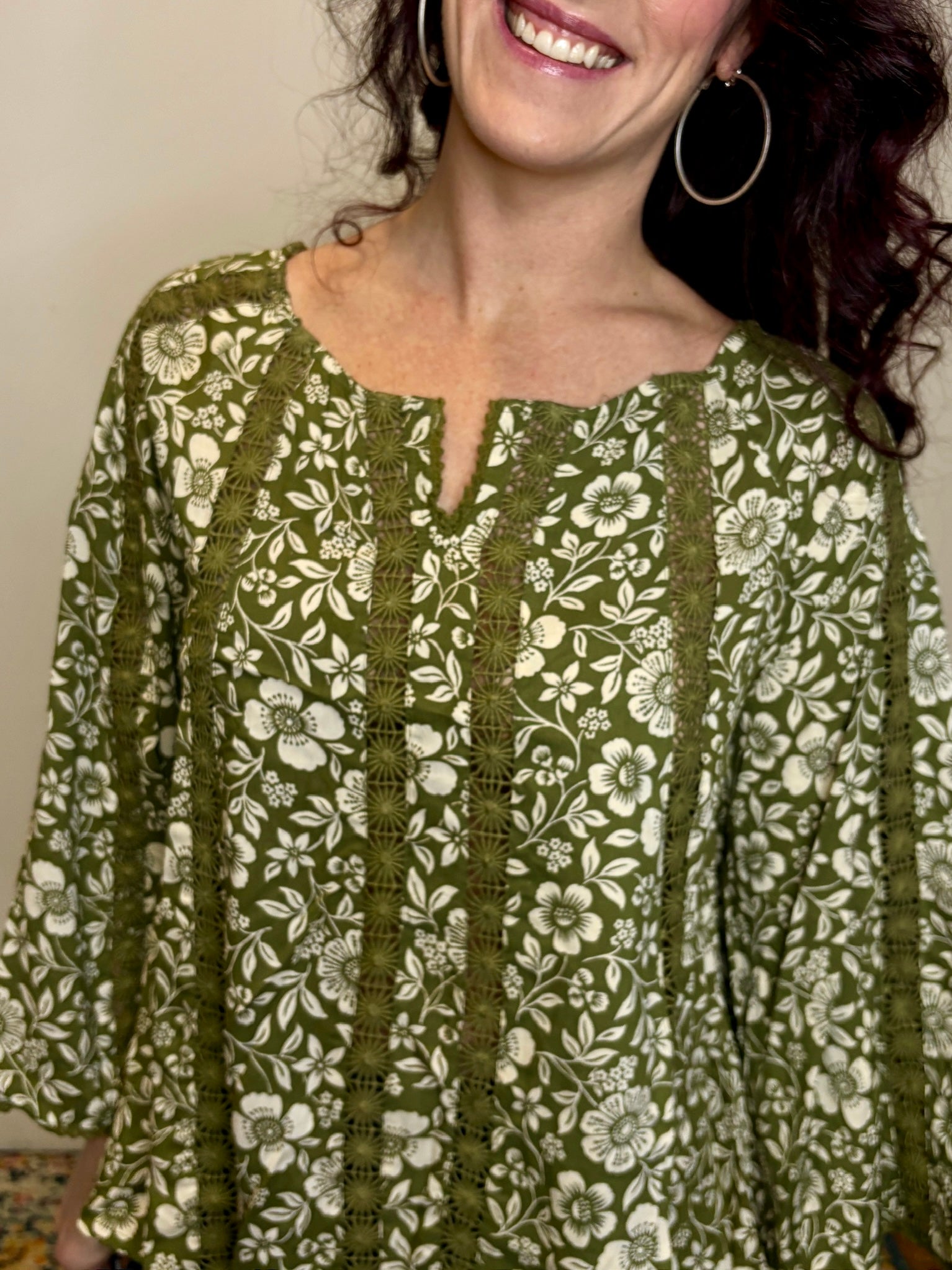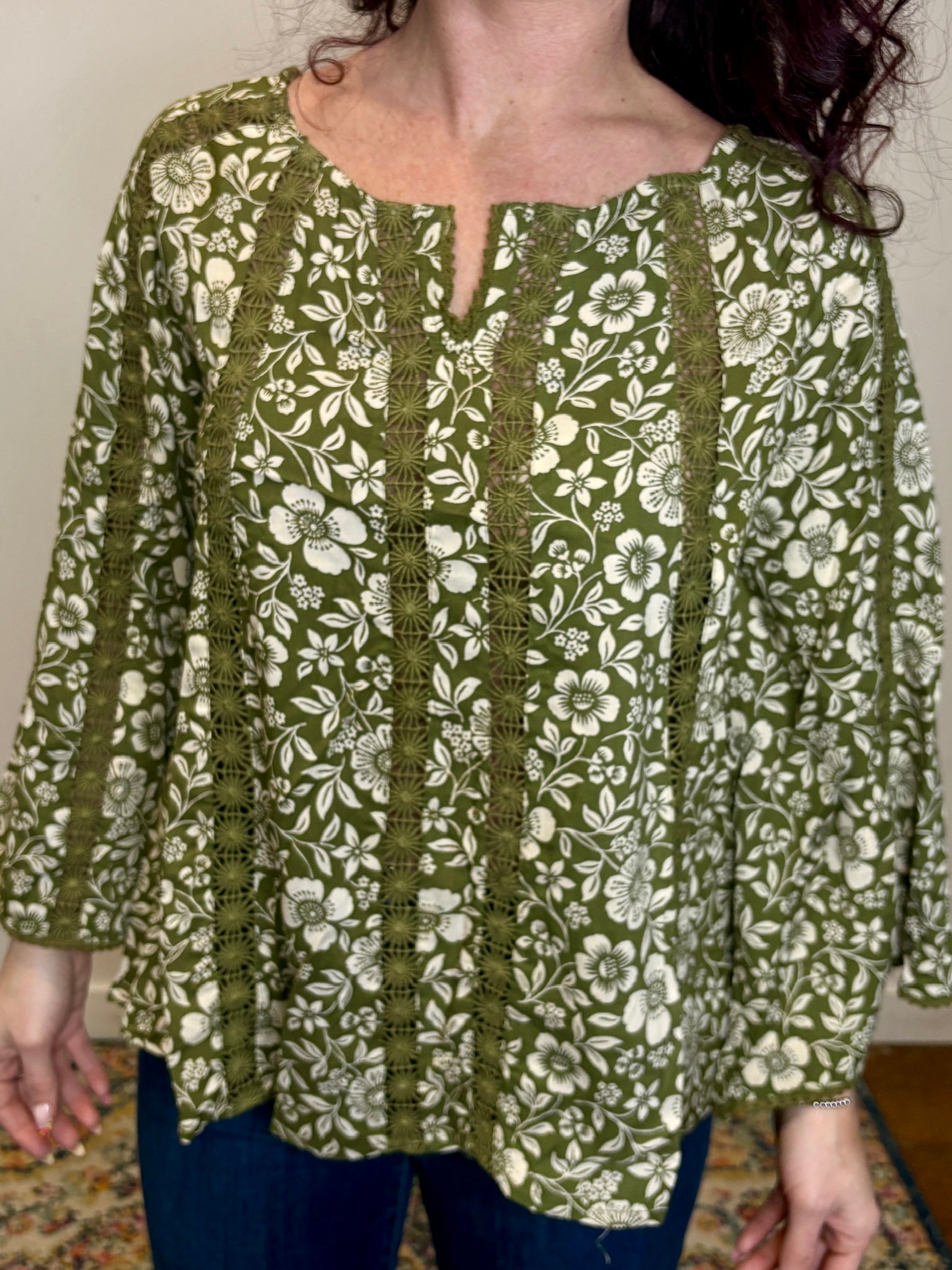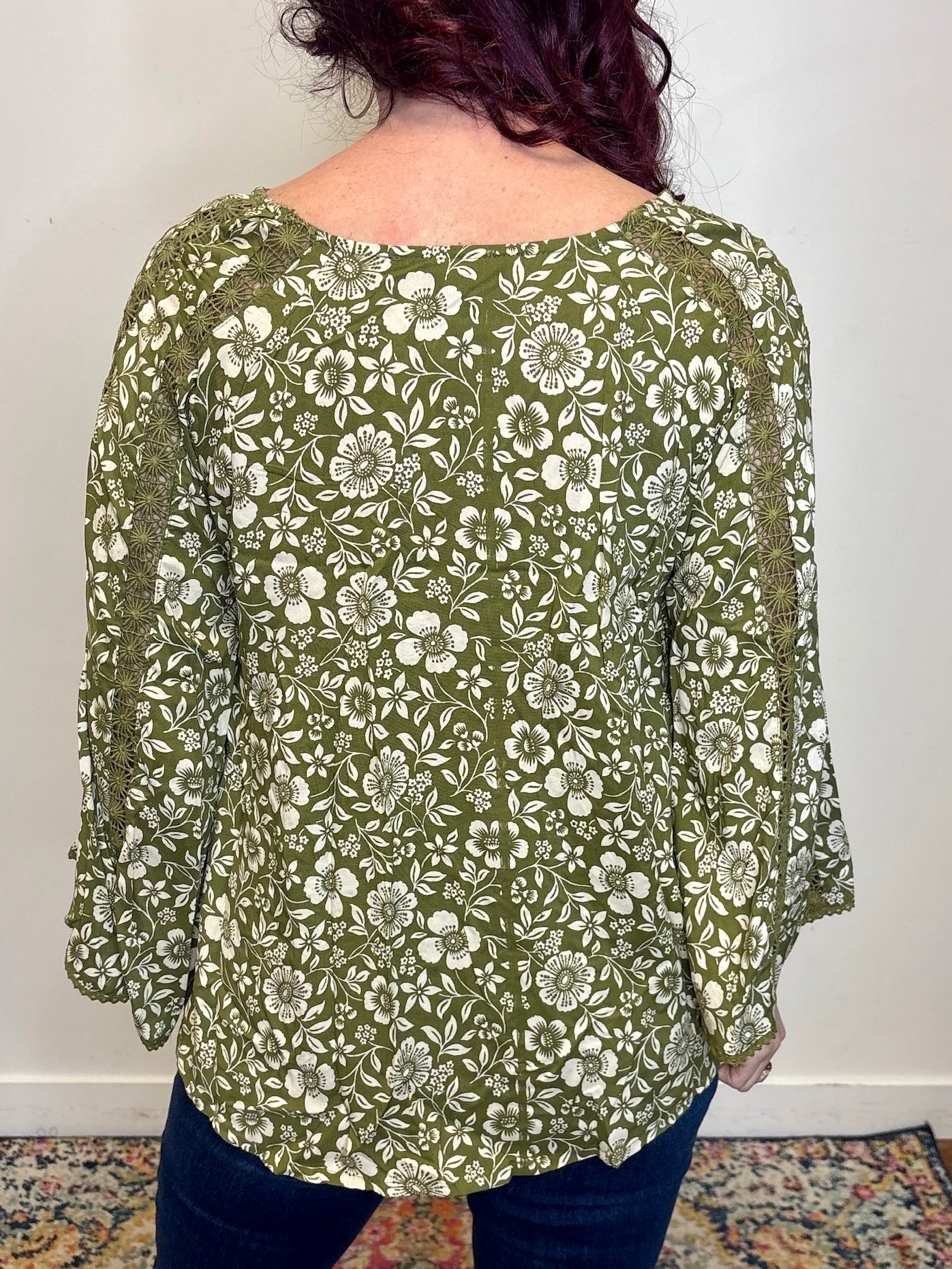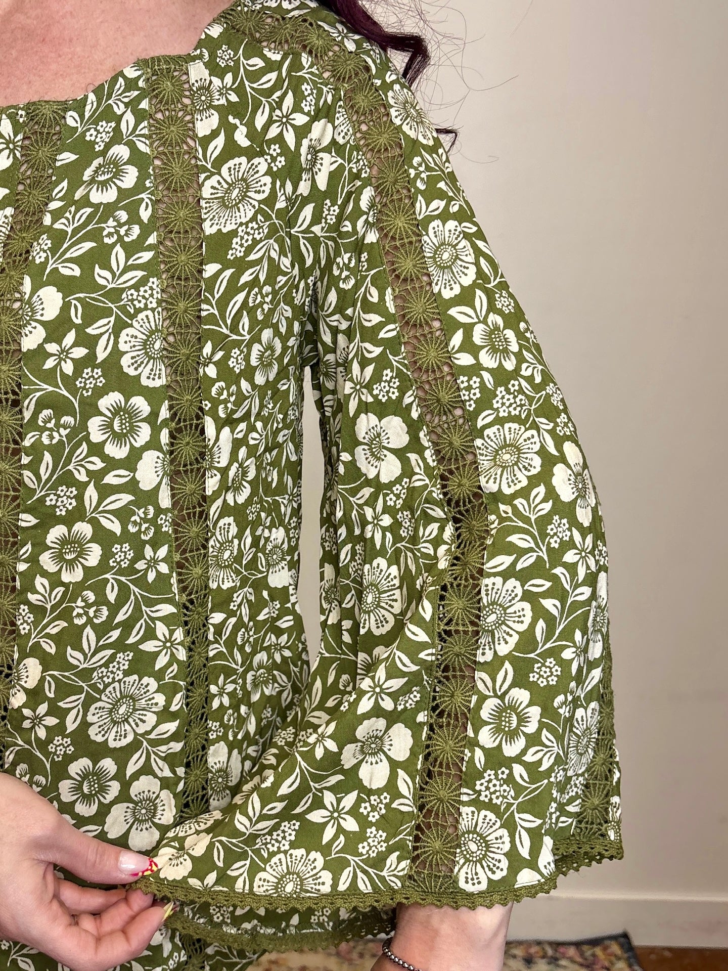 Green Lace Inset Bell Sleeve Blouse