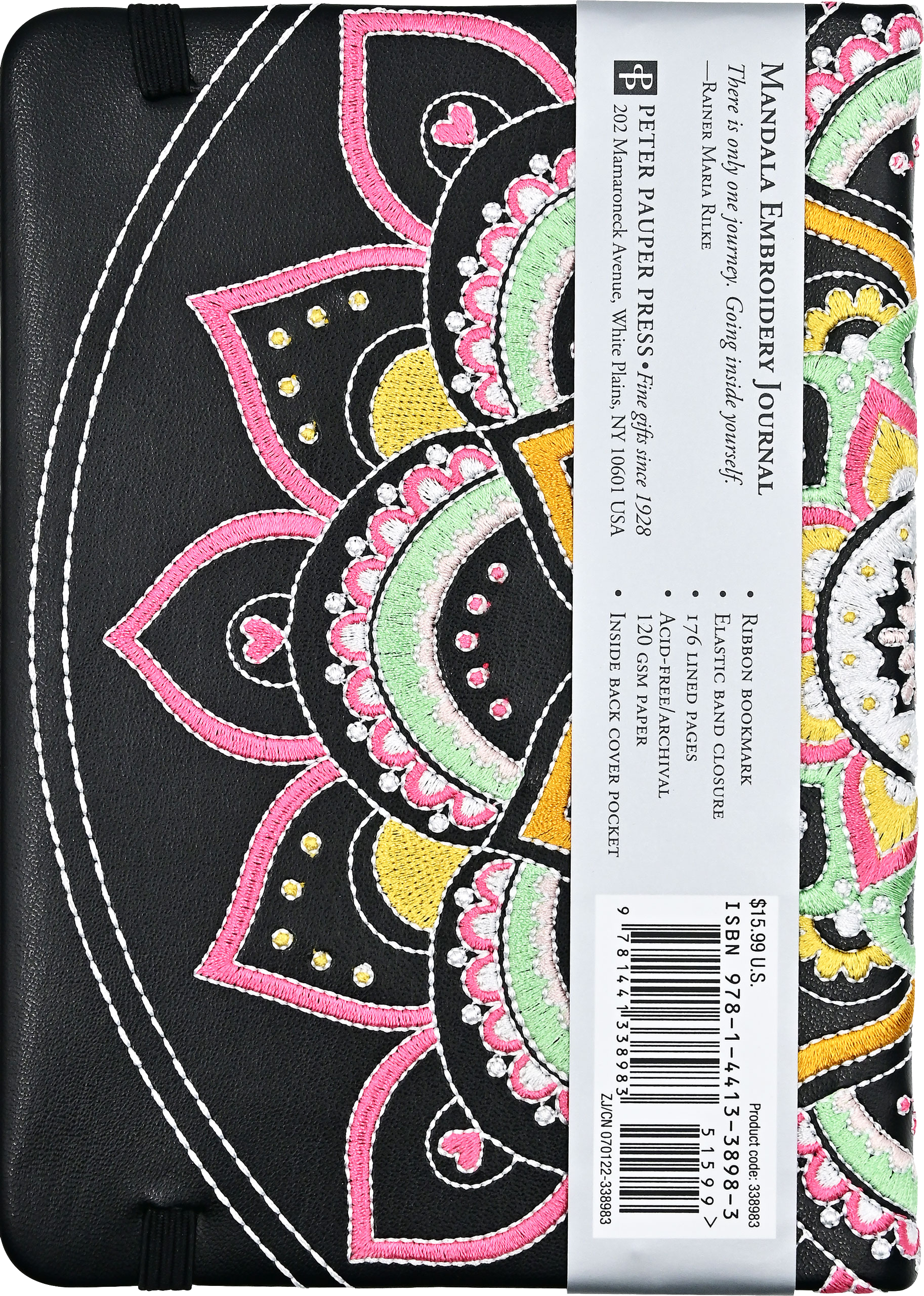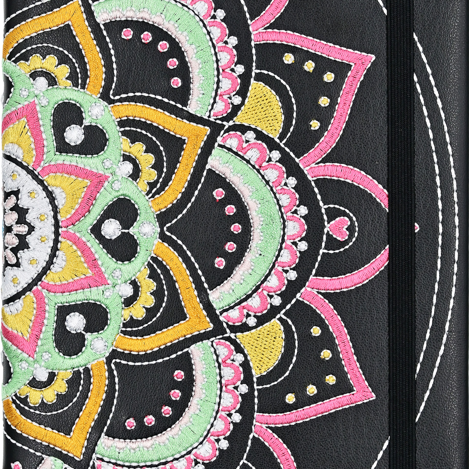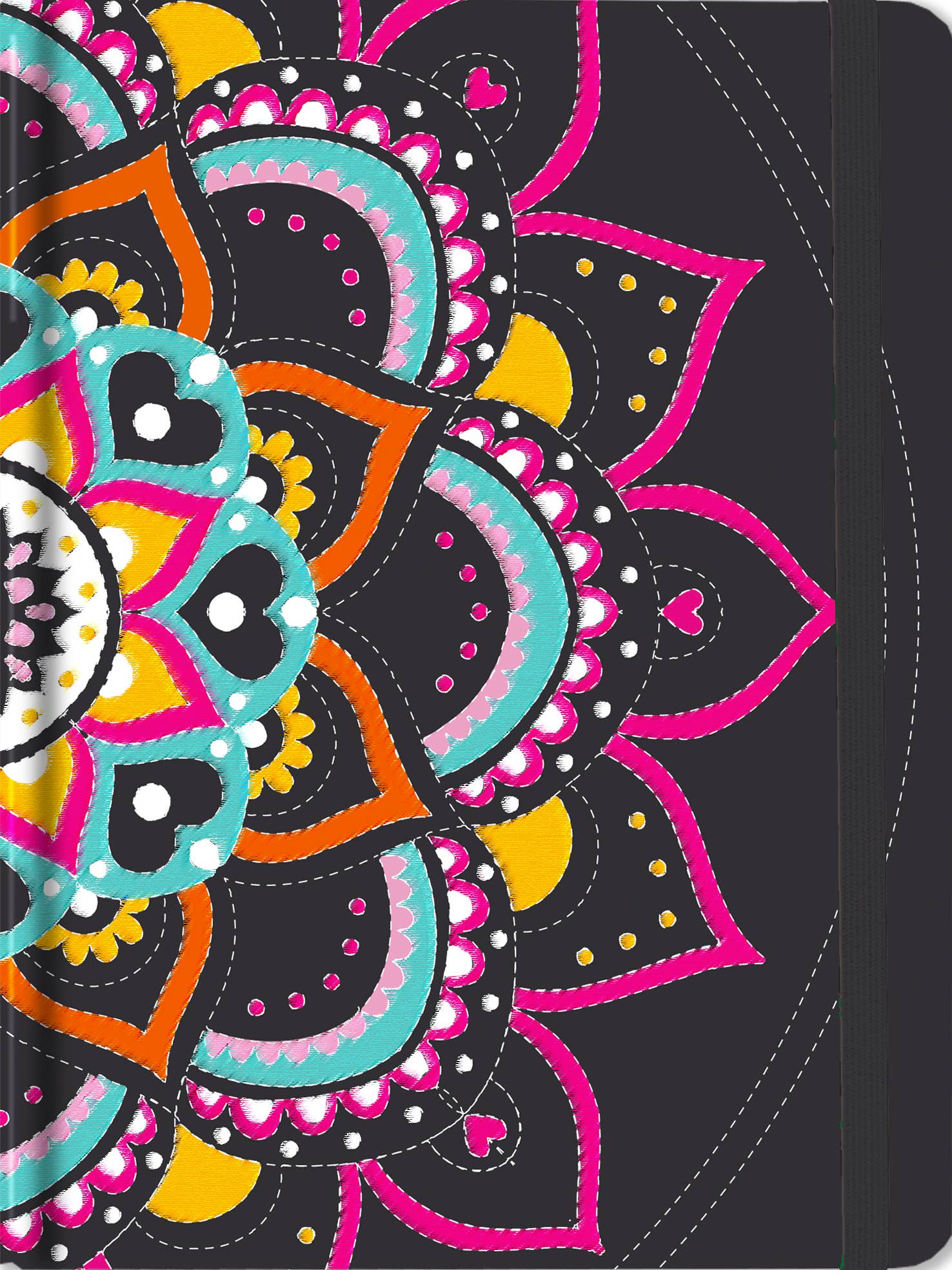Elegant journal features soft vegan leather cover material, decorative stitching and embossing, and a colorful mandala design. Crisp writing pages are perfect for personal reflection, sketching, or for jotting down favorite quotations or poems. Premium 120 gsm paper takes pen or pencil beautifully. Paper is acid free and of archival quality. Light gray lines subtly guide your writing. A ribbon bookmark keeps your place. An inside back cover pocket expands to hold notes, cards, mementos, and more. The matching elastic closure secures your journal. Complementary interior endpapers. Sturdy bookbound vegan leather journal. Rounded cover corners for reduced wear. Journal measures 5'' wide x 7'' high. Compact size fits easily in most bags and backpacks.