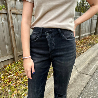 Lovervet Distressed High Rise Button Fly Black Straight Jean with Asymmetrical Waist
