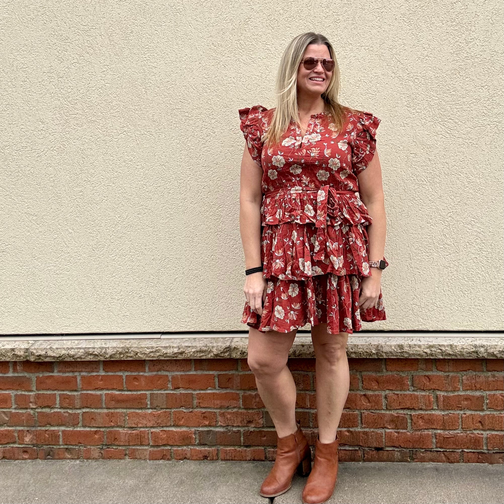 V-Neck Flutter Sleeve Ruffle Tiered Skirt Dress with Tie Belt – Gretchen's Size Inclusive Boutique